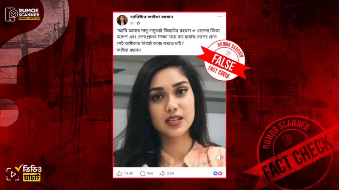সম্প্রতি, বিএনপির ভারপ্রাপ্ত চেয়ারম্যান তারেক রহমানের কন্যা জাইমা রহমান ‘আমি আমার দাদি-দাদুভাই আদর্শ এবং দেশপ্রেমের শিক্ষা নিয়ে বড় হয়েছি। দেশের প্রতি সেই অঙ্গিকার নিয়েই কাজ করতে চাই।’ শীর্ষক মন্তব্য করেছেন দাবিতে একটি ভিডিও সামাজিক যোগাযোগ মাধ্যমে ছড়িয়ে পড়েছে।