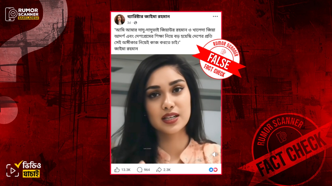 রিউমর স্ক্যানার টিমের অনুসন্ধানে জানা যায়, তারেক কন্যা জাইমা রহমানের নামে প্রচারিত আলোচিত ভিডিওটি বাস্তব নয়, বরং তার একটি ছবি ব্যবহার করে কৃত্রিম বুদ্ধিমত্তা বা এআই এর সহযোগিতায় আলোচিত ভিডিওটি তৈরি করে প্রচার করা হচ্ছে।