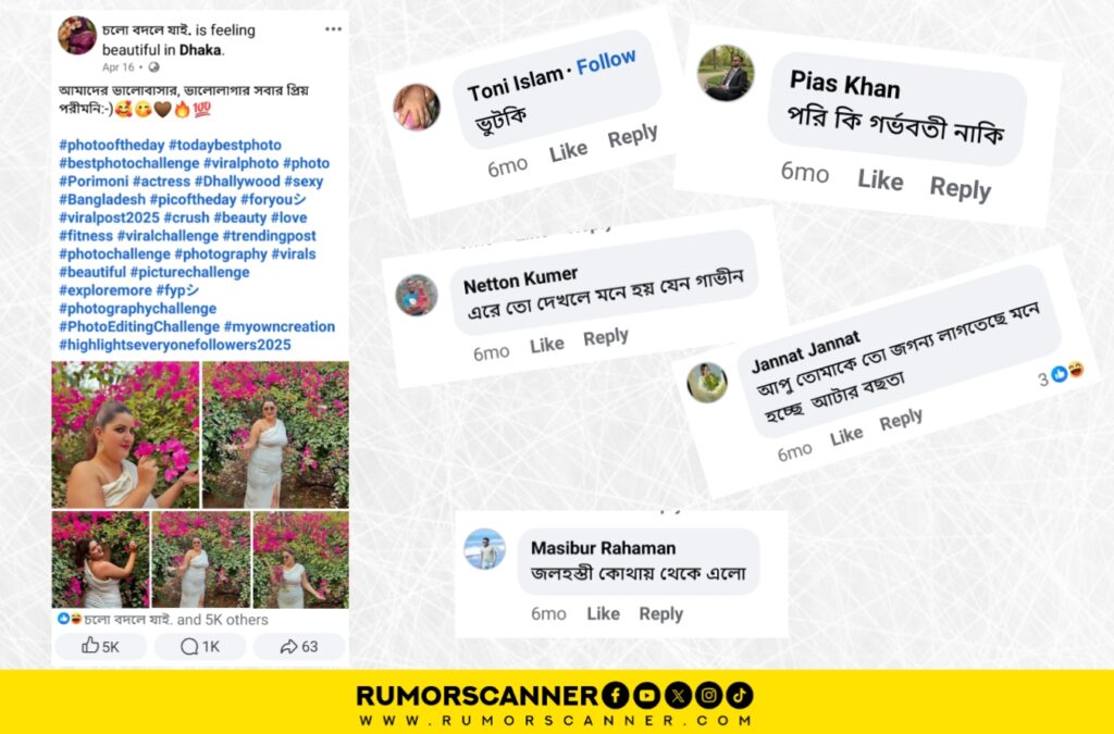 চলতি বছরের ১৬ এপ্রিল ‘চলো বদলে যাই’ নামের পেজটির সন্ধান পায় রিউমর স্ক্যানার। নিয়মিত মনিটরিংয়ের মাধ্যমে পাওয়া পেজটিতে সেদিন কিছু ছবি দিয়ে একটি পোস্টে দাবি করা হয়, ছবিগুলো ঢাকাই সিনেমার নায়িকা পরী মণির। পোস্টটিতে এখন পর্যন্ত পাঁচ হাজারের অধিক রিয়েক্ট এবং প্রায় এক হাজারের অধিক কমেন্ট এসেছে। কমেন্টগুলোতে ইতিবাচক এবং নেতিবাচক দুই ধরনের মন্তব্যই করেছেন নেটিজেনরা। তবে পর্যালোচনা করে দেখা যায়, নেতিবাচক কমেন্টের পরিমাণই বেশি এবং এর সিংহভাগই বডি শেমিং ধরনের।