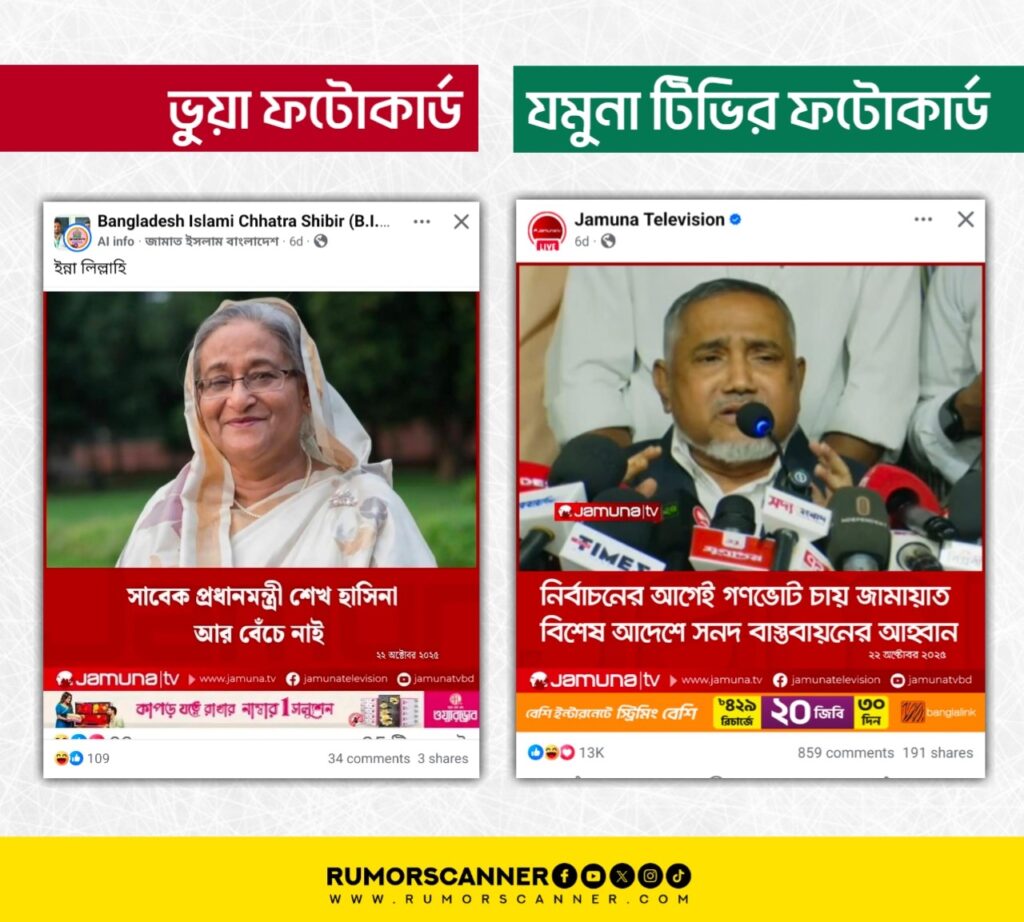 গত ২২ অক্টোবর ‘সাবেক প্রধানমন্ত্রী শেখ হাসিনা আর বেঁচে নাই’ শিরোনামে প্রথম যমুনা টেলিভিশনের ডিজাইন সংবলিত একটি ফটোকার্ড প্রচার হতে দেখা যায়।