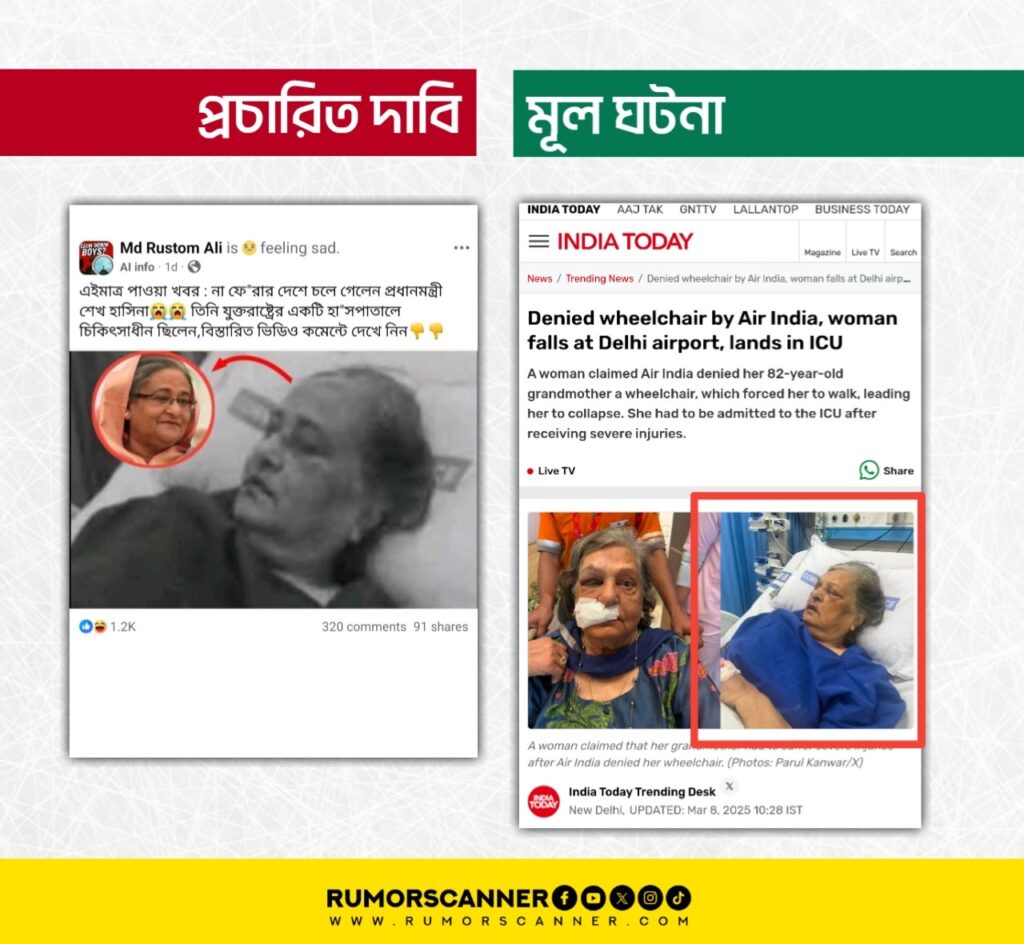 ছবিটির বিষয়ে অনুসন্ধানে রিভার্স ইমেজ সার্চের মাধ্যমে ভারতীয় গণমাধ্যম ইন্ডিয়া টুডের ওয়েবসাইটে গত ৮ মার্চ Denied wheelchair by Air India, woman falls at Delhi airport, lands in ICU শিরোনামে প্রচারিত একটি প্রতিবেদন খুঁজে পাওয়া যায়। শেখ হাসিনার মরদেহের ছবি দাবিতে প্রচারিত ছবির সাথে উক্ত প্রতিবেদনে ব্যবহৃত একটি ছবির মিল রয়েছে।