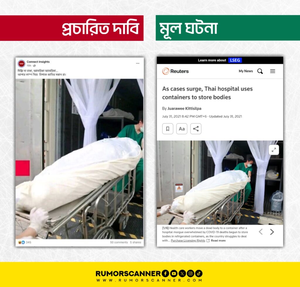 ছবিটির বিষয়ে অনুসন্ধানে জানা যায়, ছবিটি ২০২১ সালে থাইল্যান্ডের পথুম থানি প্রদেশে তোলা হয়েছে। করোনা ভাইরাসের প্রকোপের সেসময় দেশটির হাসপাতালগুলো মৃত্যুপুরিতে পরিণত হয়ে যায়। তাই হাসপাতালের মর্গ লাশে পরিপূর্ণ হয়ে গেছে দেশটির হাসপাতালগুলো ফ্রিজিং কন্টেইনারে লাশ সংরক্ষণ করতো। আলোচিত ছবিতে দেখতে পাওয়া লাশটিও হাসপাতাল থেকে কন্টেইনারে নেওয়া হচ্ছে বলে জানা যায়।
