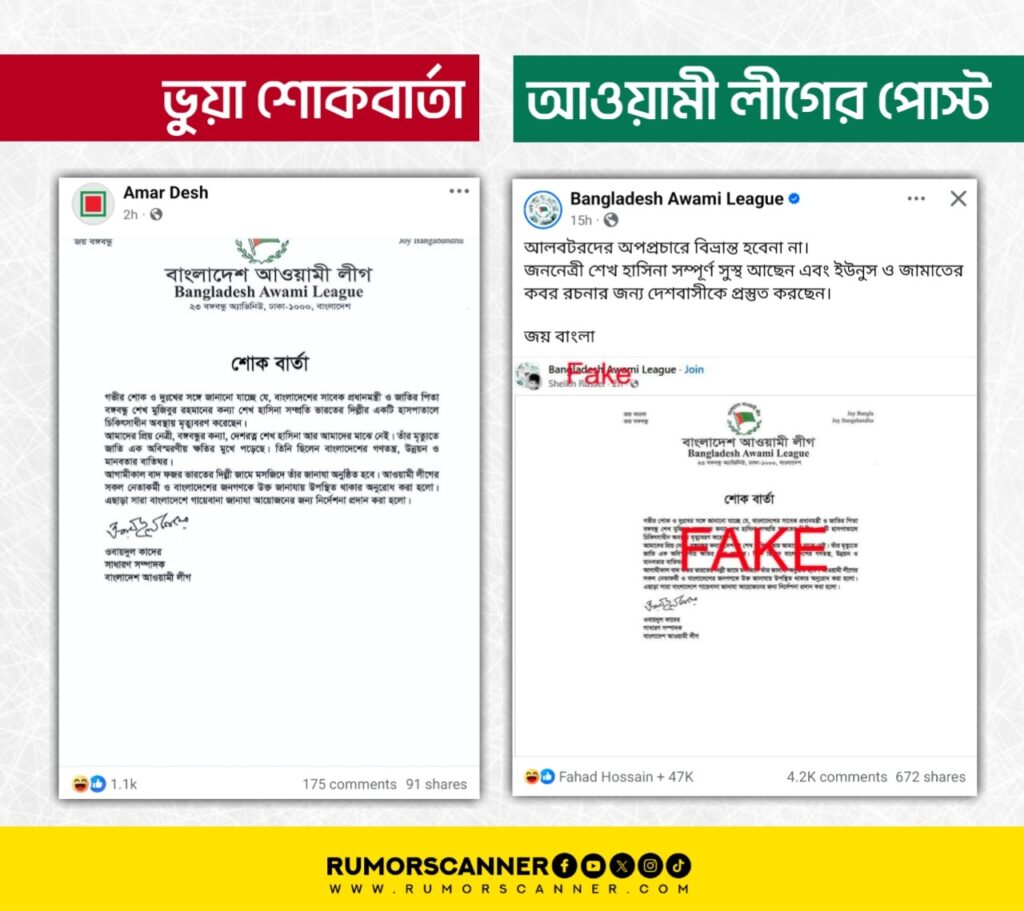 সর্বশেষ গতকাল অর্থাৎ, ২৮ অক্টোবর রাতে দৈনিক আমার দেশ পত্রিকার নামে পরিচালিত একটি ভুয়া পেজে শেখ হাসিনার মৃত্যুতে বাংলাদেশ আওয়ামী লীগ শোকবার্তা প্রকাশ করেছে দাবিতে একটি বিজ্ঞপ্তি পোস্ট করা হয়।