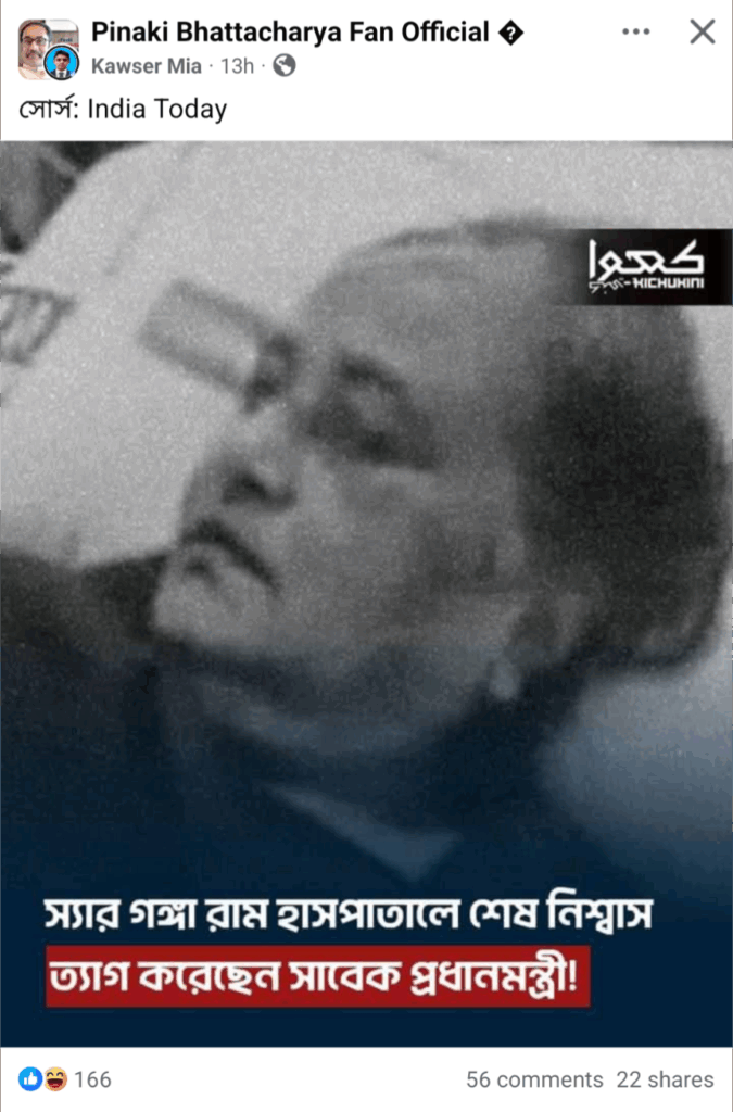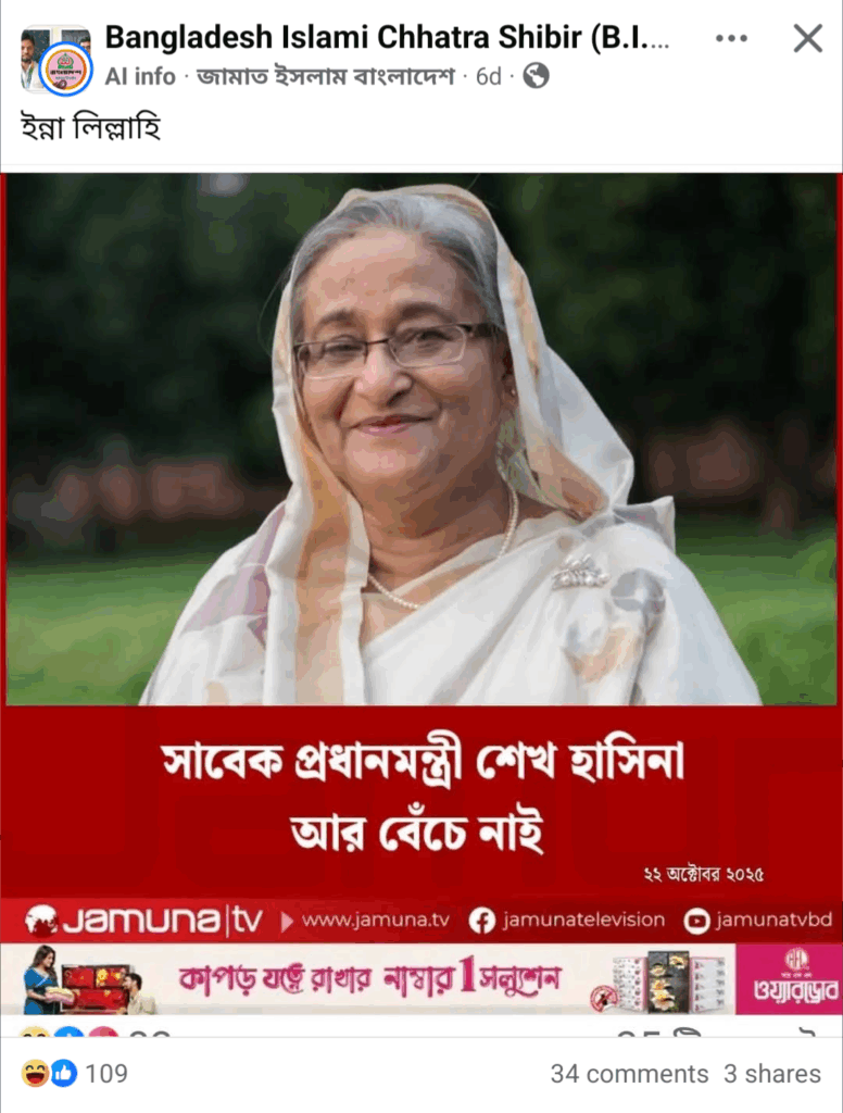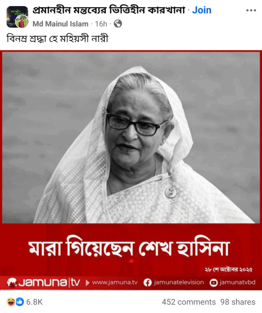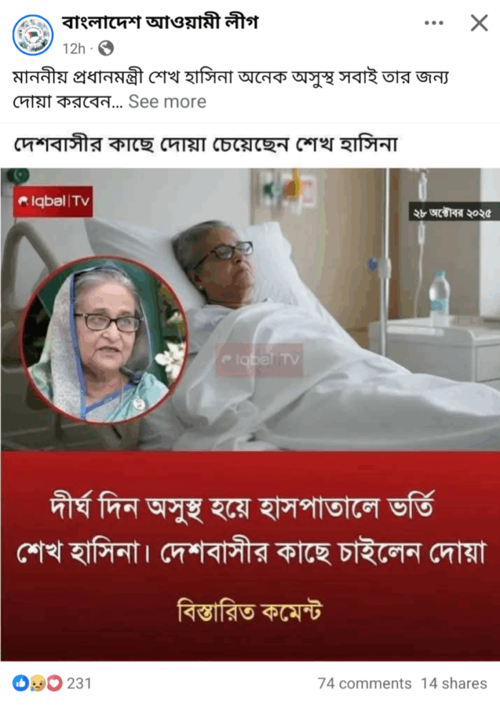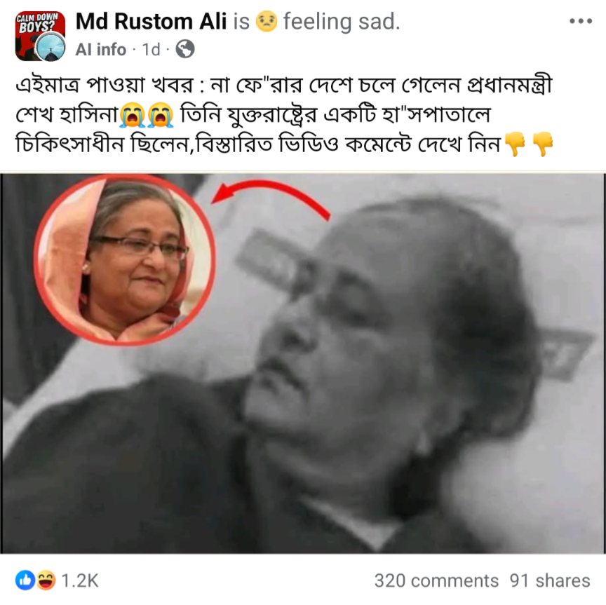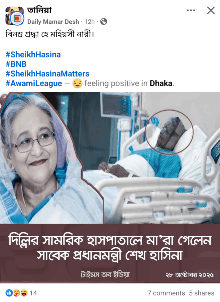 গত বছরের ৫ আগস্ট ছাত্র-জনতার অভ্যুত্থানে ক্ষমতাচ্যুত হয় তৎকালীন আওয়ামী লীগ সরকার। সেদিনই দেশ ত্যাগ করে পাশ্বর্বর্তী রাষ্ট্র ভারতে আশ্রয় নেন সাবেক প্রধানমন্ত্রী ও বাংলাদেশ আওয়ামী লীগ এর সভাপতি শেখ হাসিনা। এরপর তাকে আর প্রকাশ্যে দেখা যায়নি। তবে এরমধ্যে বেশ কয়েকবার তার অডিওবার্তা প্রচার ও কলে দলীয় নেতাকর্মীদের সাথে অংশগ্রহণ করার তথ্য আওয়ামী লীগের ফেসবুক পেজ সূত্রে পাওয়া যায়। কিন্তু গত কয়েকদিন যাবৎ ইন্টারনেটে তিনি মারা গেছেন দাবিতে বেশ কয়েকটি অপতথ্য ছড়িয়ে পড়তে দেখেছে রিউমর স্ক্যানার।