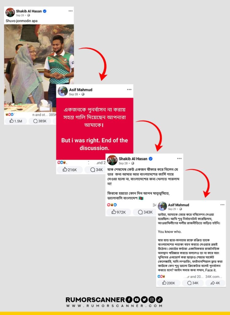 আসিফ-সাকিবের পাল্টাপাল্টি এসব পোস্টের সূত্রেই বাংলাদেশের ক্রিকেটে সাকিবের ফেরা বা না ফেরার বিষয়টি নিয়ে ফের আলোচনা শুরু হয়েছে। তার প্রেক্ষিতে সামাজিক যোগাযোগের বিভিন্ন মাধ্যমে একাধিক অপতথ্যের প্রচারও দেখা যাচ্ছে৷