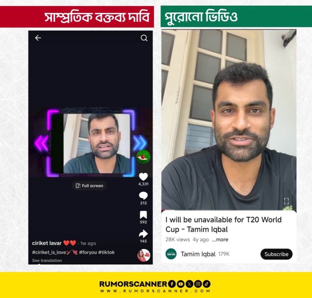 অনুসন্ধানে তামিম ইকবালের অফিশিয়াল ইউটিউব চ্যানেলে ২০২১ সালের ০১ সেপ্টেম্বর ‘I will be unavailable for T20 World Cup’ শিরোনামে প্রকাশিত একটি ভিডিও খুঁজে পাওয়া যায়। উক্ত ভিডিওটির সাথে প্রচারিত ভিডিওটির মিল পাওয়া যায়।