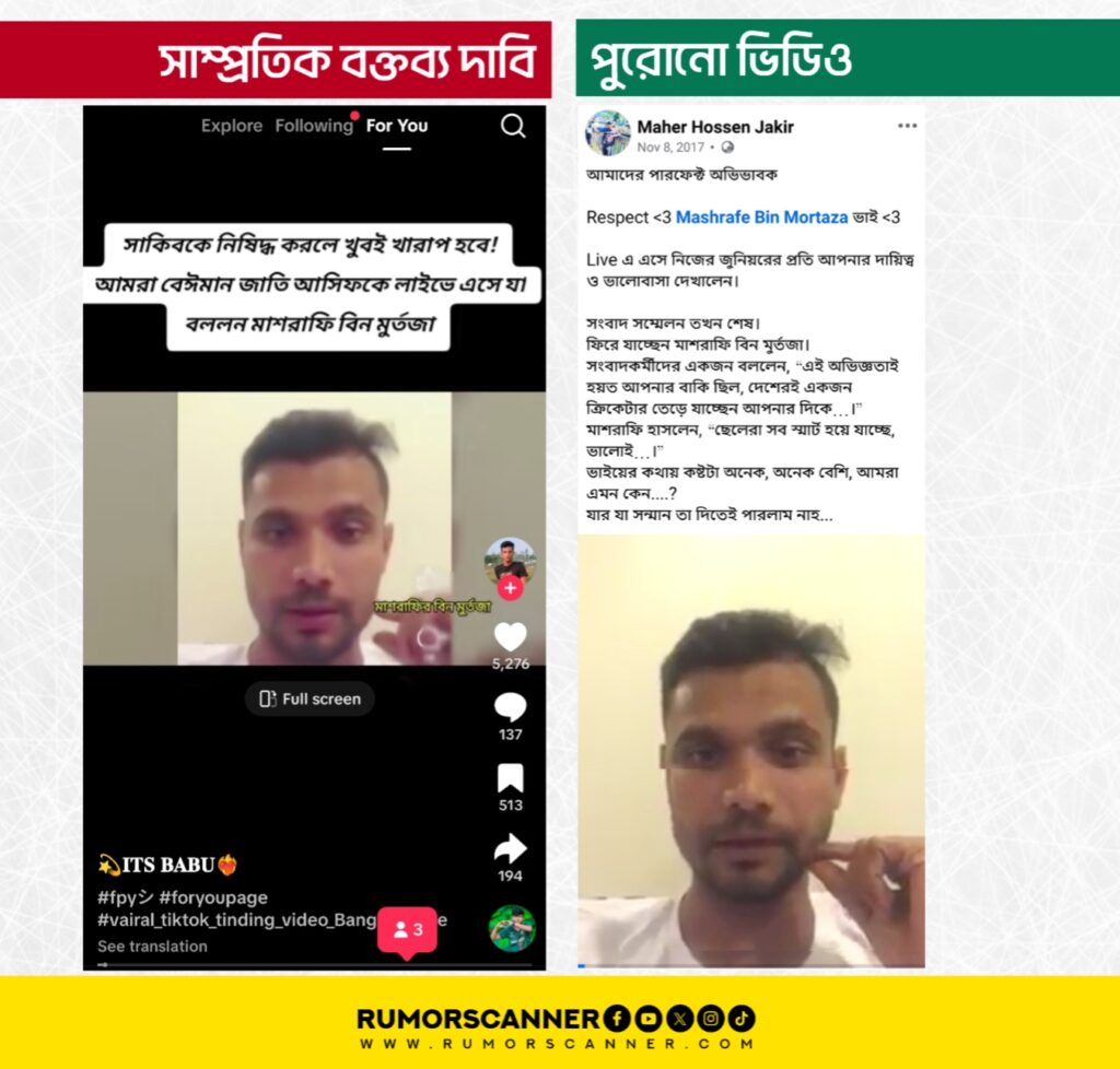 সাকিব আল হাসান প্রসঙ্গে সাবেক ক্রিকেটার মাশরাফি বিন মোর্ত্তজা “আমরা বেঈমান জাতি। সাকিবকে নিষিদ্ধ করলে খুব খারাপ হবে।” বলে মন্তব্য করেছেন দাবিতে একটি ভিডিও প্রচার হচ্ছে।