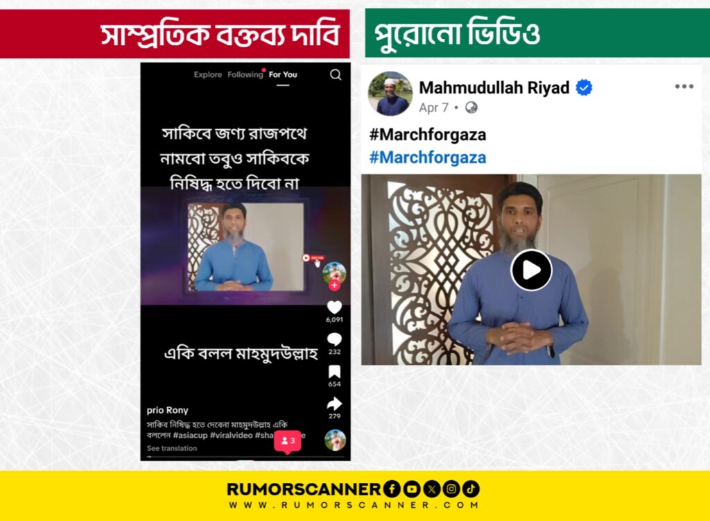 সাকিব আল হাসান প্রসঙ্গে সাবেক ক্রিকেটার মাহমুদউল্লাহ রিয়াদ “সাকিবের জন্য রাজপথে নামবো। তবু সাকিবকে নিষিদ্ধ হতে দেবো না।” বলে মন্তব্য করেছেন দাবিতে একটি ভিডিও প্রচার হচ্ছে।