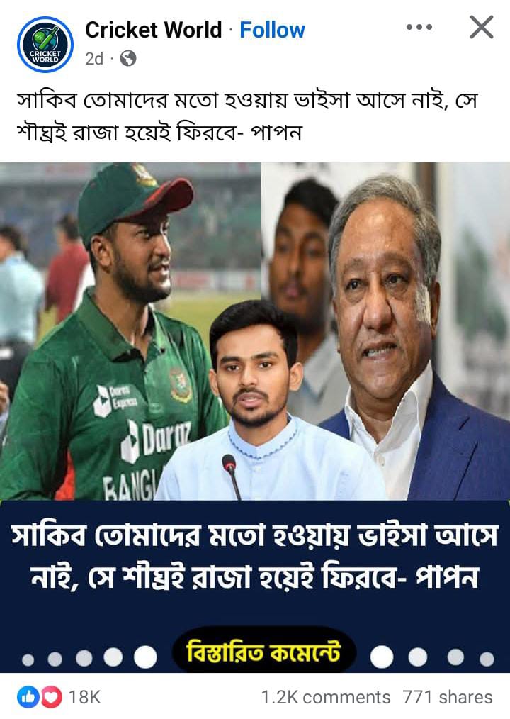 সাকিব আল হাসান প্রসঙ্গে সাবেক যুব ও ক্রীড়ামন্ত্রী এবং বাংলাদেশ ক্রিকেট বোর্ডের (বিসিবি) সাবেক সভাপতি নাজমুল হাসান পাপন “সাকিব তোমাদের মতো হওয়ায় ভাইসা আসে নাই, সে শৗঘ্রই রাজা হয়েই ফিরবে।” বলে মন্তব্য কেছেন দাবিতে একটি ভিডিও প্রচার হচ্ছে।