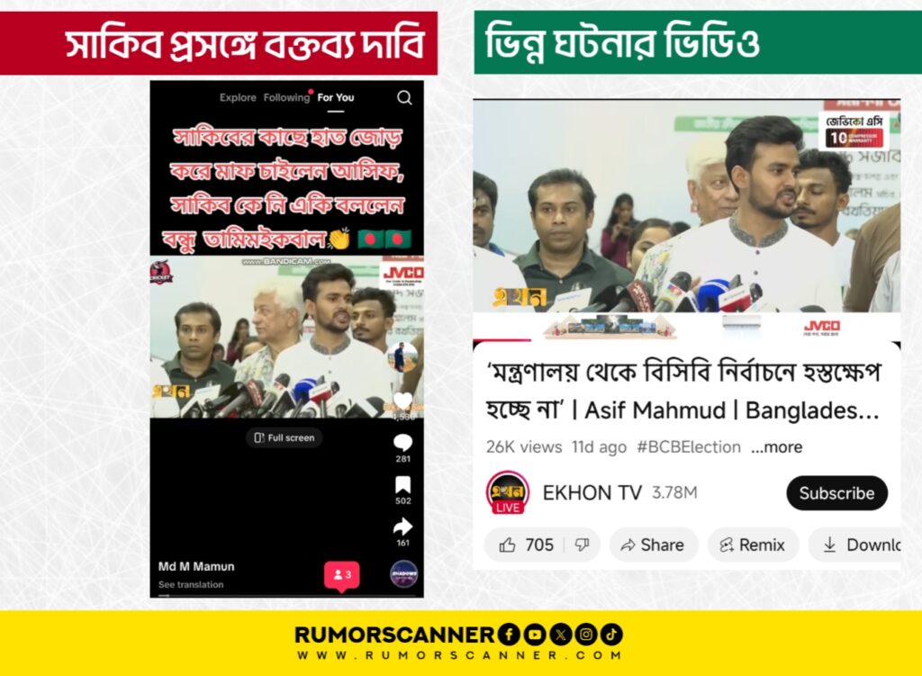 অন্তর্বর্তীকালীন সরকারের যুব ও ক্রীড়া উপদেষ্টা আসিফ মাহমুদ সজীব ভুঁইয়া লাইভে এসে সাকিব আল হাসানের কাছে ক্ষমা চেয়েছেন শীর্ষক দাবিতে একটি ভিডিও ফুটেজ প্রচার করা হচ্ছে।
