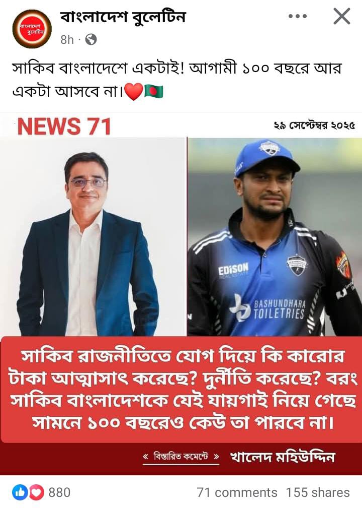 সাকিব আল হাসান প্রসঙ্গে সাংবাদিক খালেদ মুহিউদ্দীন “সাকিব বাংলাদেশকে যে যায়গাই নিয়ে গেছে সামনে ১০০ বছরেও কেউ তা পারবে না” বলে বক্তব্য দিয়েছেন শীর্ষক একটি দাবি প্রচার হচ্ছে।