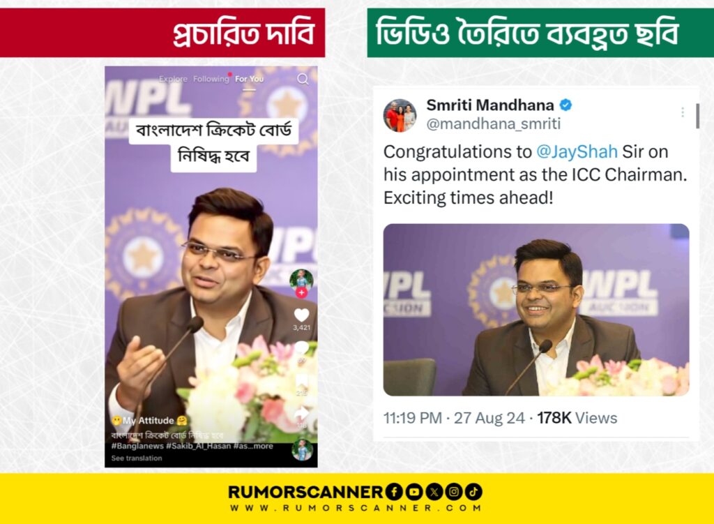 সাকিব আল হাসান প্রসঙ্গে আইসিসির চেয়ারম্যান জয় শাহ “নিউজ দেখা যাচ্ছে যে সাকিবকে নিষিদ্ধ করতে চায় বাংলাদেশ ক্রিকেট বোর্ড। আইসিসির নিয়ম ছাড়া সাকিবকে নিষিদ্ধ করলে আইসিসি বিসিবিকেই নিষিদ্ধ করে দিবে।” বলে মন্তব্য করে দাবিতে একটি ভিডিও প্রচার করা হচ্ছে।