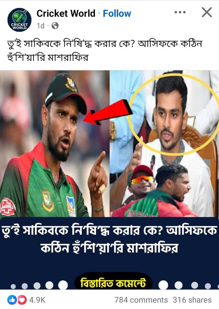 অর্থাৎ, সাবেক ক্রিকেটার মাশরাফি বিন মোর্ত্তজার নামে ভুয়া মন্তব্য ছড়ানো হয়েছে।