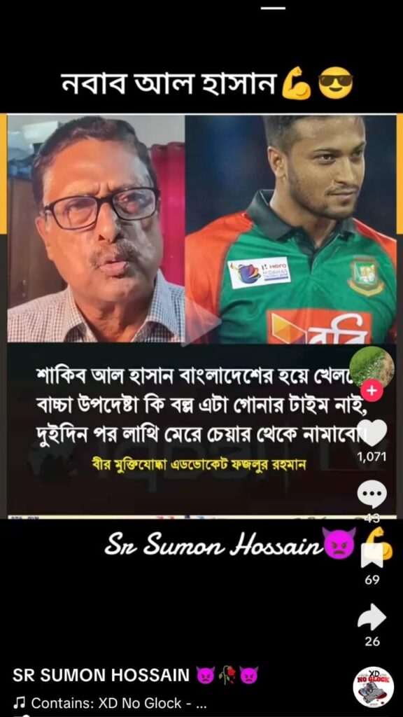সাকিব আল হাসান প্রসঙ্গে বিএনপির চেয়ারপারসনের উপদেষ্টা অ্যাডভোকেট ফজলুর রহমান “শাকিব আল হাসান বাংলাদেশের হয়ে খেলবেন, বাচ্চা উপদেষ্টা কি বল্ল এটা গোনার টাইম নাই, দুইদিন পর লাথি মেরে চেয়ার থেকে নামাবো।” বলে মন্তব্য করেছেন শীর্ষক একটি দাবি প্রচার হচ্ছে।