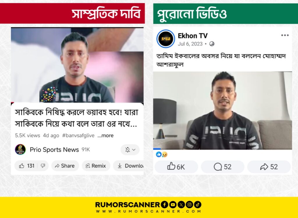 সাকিব আল হাসান প্রসঙ্গে সাবেক ক্রিকেটার মোহাম্মদ আশরাফুল “সাকিবকে নিষিদ্ধ করলে ভয়াবহ হবে! যারা সাকিবকে নিয়ে কথা বলে তারা ওর নখের যোগ্য” বলে মন্তব্য করেছেন দাবিতে একটি ভিডিও প্রচার হচ্ছে।
