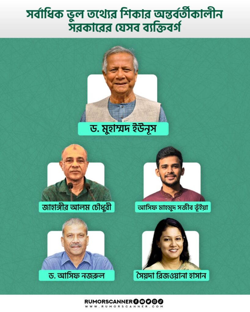 এছাড়া এই সরকারের নয় জন উপদেষ্টাকে জড়িয়ে গেল তিন মাসে সর্বমোট ২৫টি ভুল তথ্য প্রচার করা হয়েছে। এদের মধ্যে জাহাঙ্গীর আলম চৌধুরীকে জড়িয়ে নয়টি, আসিফ মাহমুদ সজীব ভূঁইয়াকে জড়িয়ে পাঁচটি, ড. আসিফ নজরুলকে জড়িয়ে চারটি, সৈয়দা রিজওয়ানা হাসানকে জড়িয়ে দুইটি এবং মাহফুজ আলম, ড. সালেহউদ্দিন আহমেদ, সি আর আবরার,