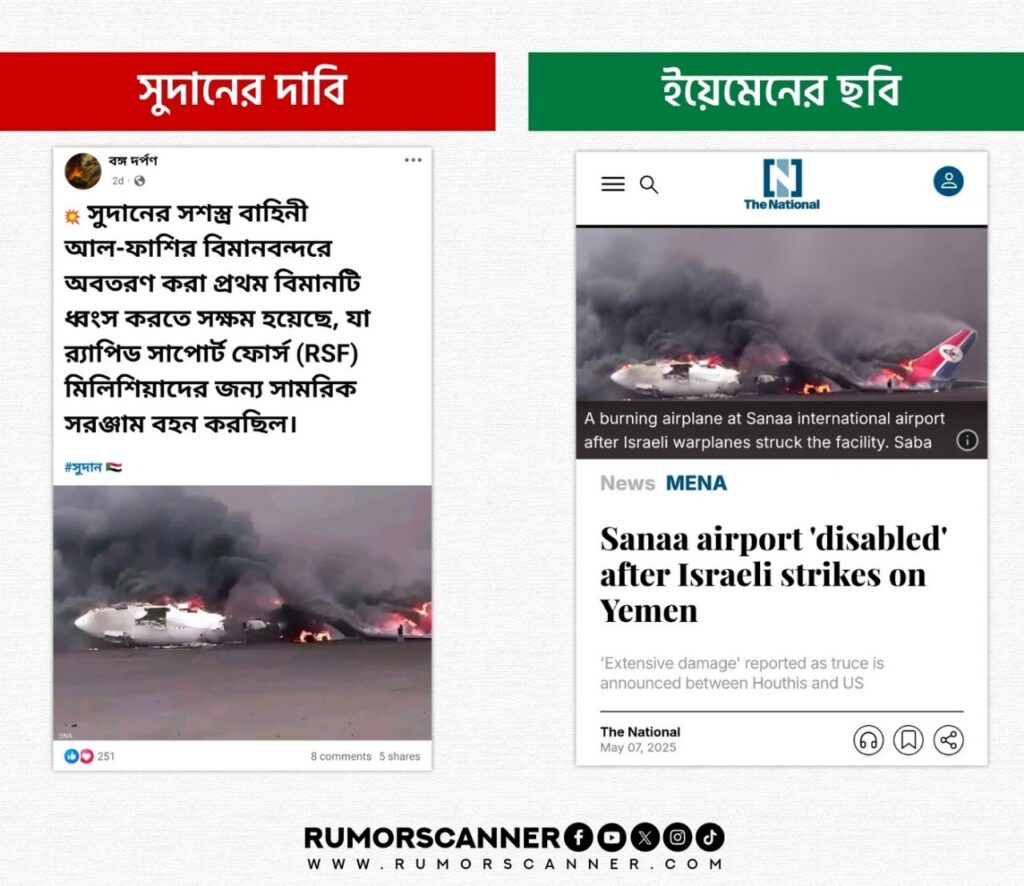 এ বিষয়ে রিউমর স্ক্যানারের অনুসন্ধানে, সংযুক্ত আরব আমিরাতের সংবাদপত্র দ্য ন্যাশনাল-এ চলতি বছরের ৭ মে প্রকাশিত প্রতিবেদনে একই ছবি পাওয়া যায়। বর্ণনায় বলা হয়, এটি ইসরায়েলি যুদ্ধবিমানের হামলায় সানা আন্তর্জাতিক বিমানবন্দরে জ্বলন্ত বিমানের দৃশ্য। আল-জাজিরায় তার একদিন আগে একই ঘটনার ভিডিও প্রকাশিত হয়। রয়টার্স জানায়, মে মাসে ইয়েমেনের রাজধানী সানার প্রধান বিমানবন্দরে ইসরায়েল একাধিক হামলা চালায়।