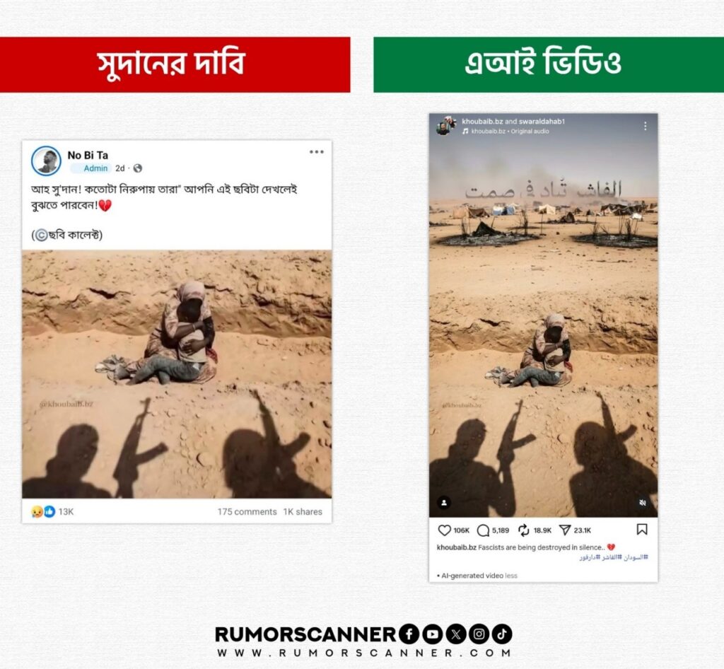সুদানের এই ভয়াবহ মানবিক সংকটের নানা ছবি ও ভিডিও সামাজিক মাধ্যমে দ্রুত ছড়িয়ে পড়ছে। তবে এই তথ্যপ্রবাহের মধ্যেই বিভিন্ন প্ল্যাটফর্মে একাধিক ভুয়া ও বিভ্রান্তিকর তথ্যও প্রচারিত হচ্ছে। রিউমর স্ক্যানারের অনুসন্ধানে সামাজিক মাধ্যমে প্রচারিত এমন ৮টি ছবি ও ১টি ভিডিও কেন্দ্রীক ভুল তথ্য পাওয়া গেছে।