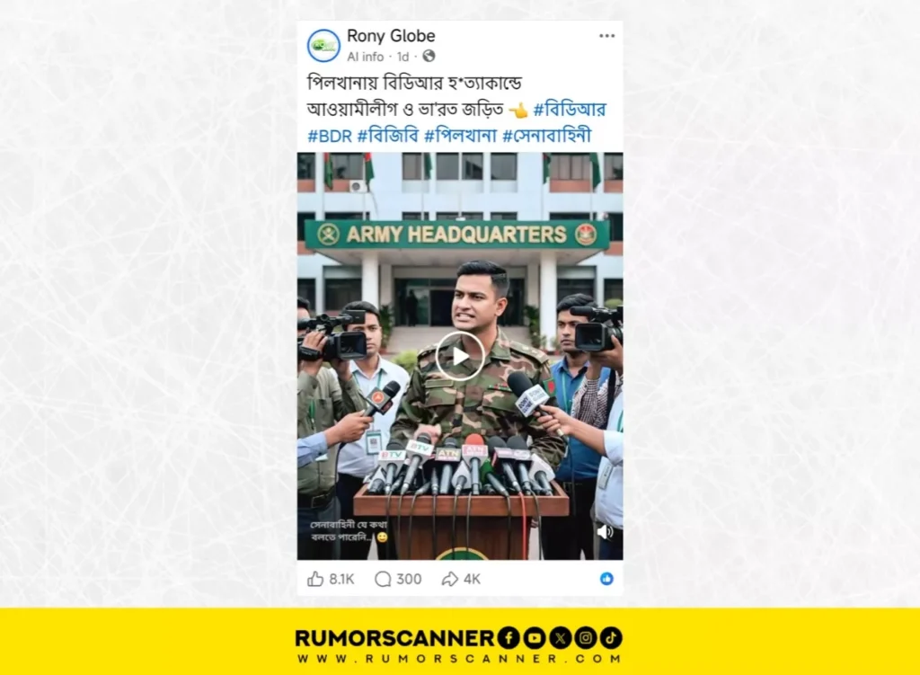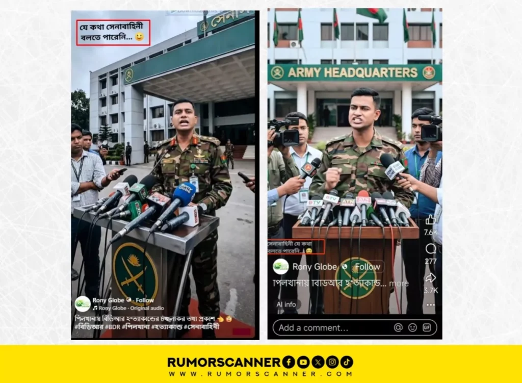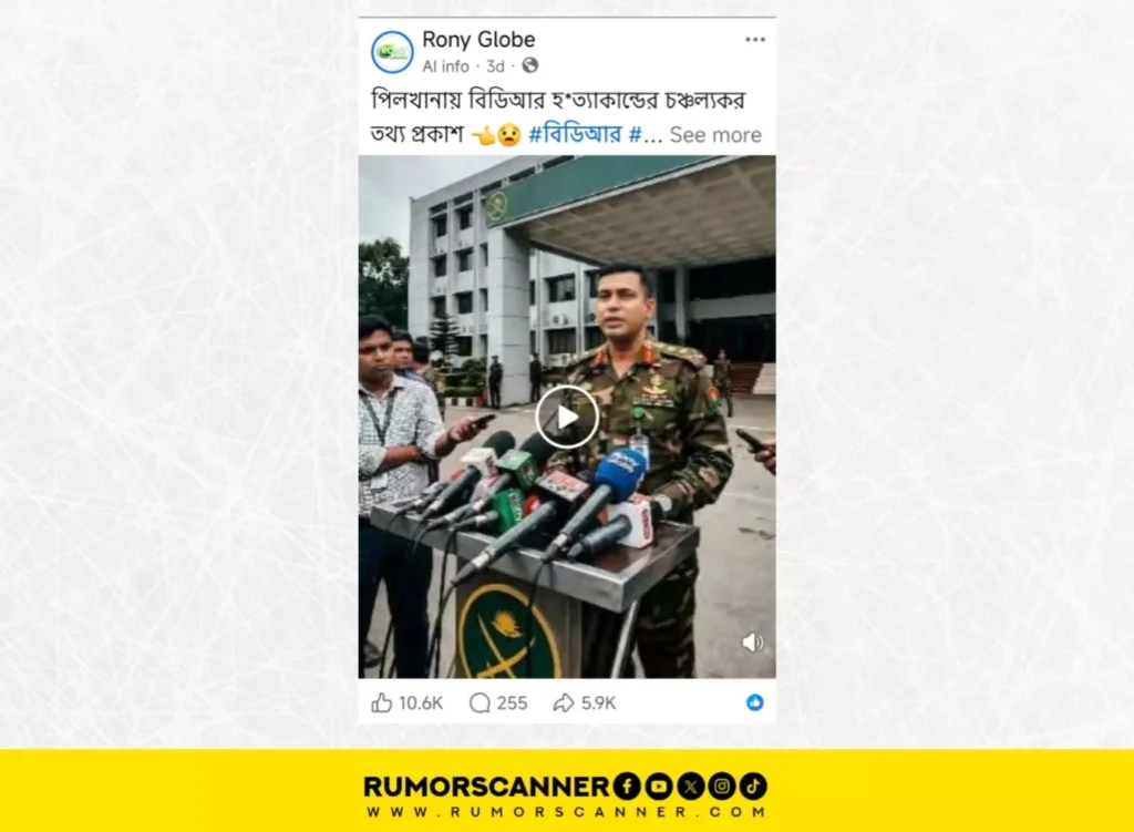 “বিডিআর হত্যাকান্ড নিয়ে একটি চাঞ্চল্যকর অনুসন্ধান উঠে এসেছে। আওয়ামী লীগ ও ভারতের যৌথ উদ্যোগেই এই ঘটনাটি ঘটানো হয়েছিল। পিলখানায় সেই বর্বরতার মাধ্যমে আওয়ামী লীগ ও ভারত আধিপত্য প্রতিষ্ঠা করেছিল। তারা বাংলাদেশকে পঙ্গু করে স্বার্থ হাসিল করেছিল।” বাংলাদেশ সেনাবাহিনীর পোশাকে একজন ব্যক্তি ডায়াসের পেছনে দাঁড়িয়ে সাংবাদিকদের সামনে এই বক্তব্য দিচ্ছেন এমন একটি ভিডিও প্রচার হচ্ছে ফেসবুকে।