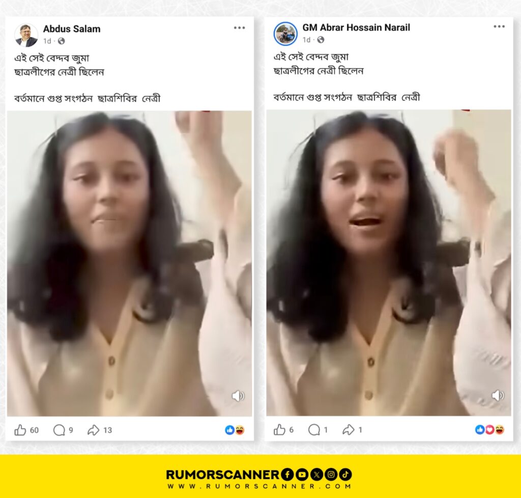 সম্প্রতি, ‘জুমা ছাত্রলীগের নেত্রী ছিলেন বর্তমানে গুপ্ত সংগঠন ছাত্রশিবির নেত্রী’ শীর্ষক ক্যাপশনে একটি ভিডিও সামাজিক যোগাযোগ মাধ্যমে ছড়িয়ে পড়েছে।