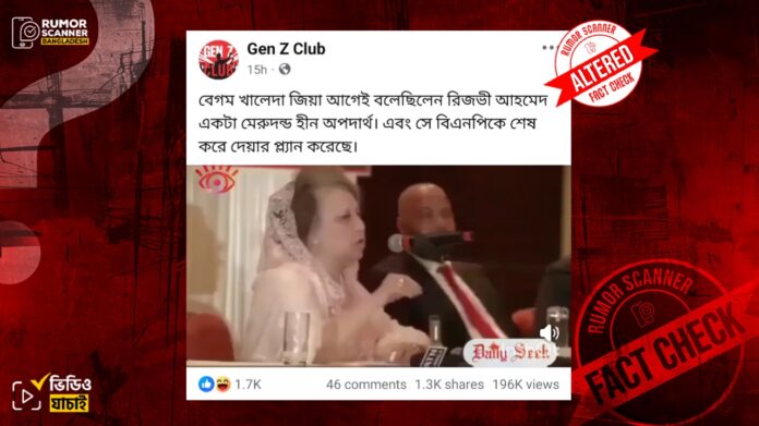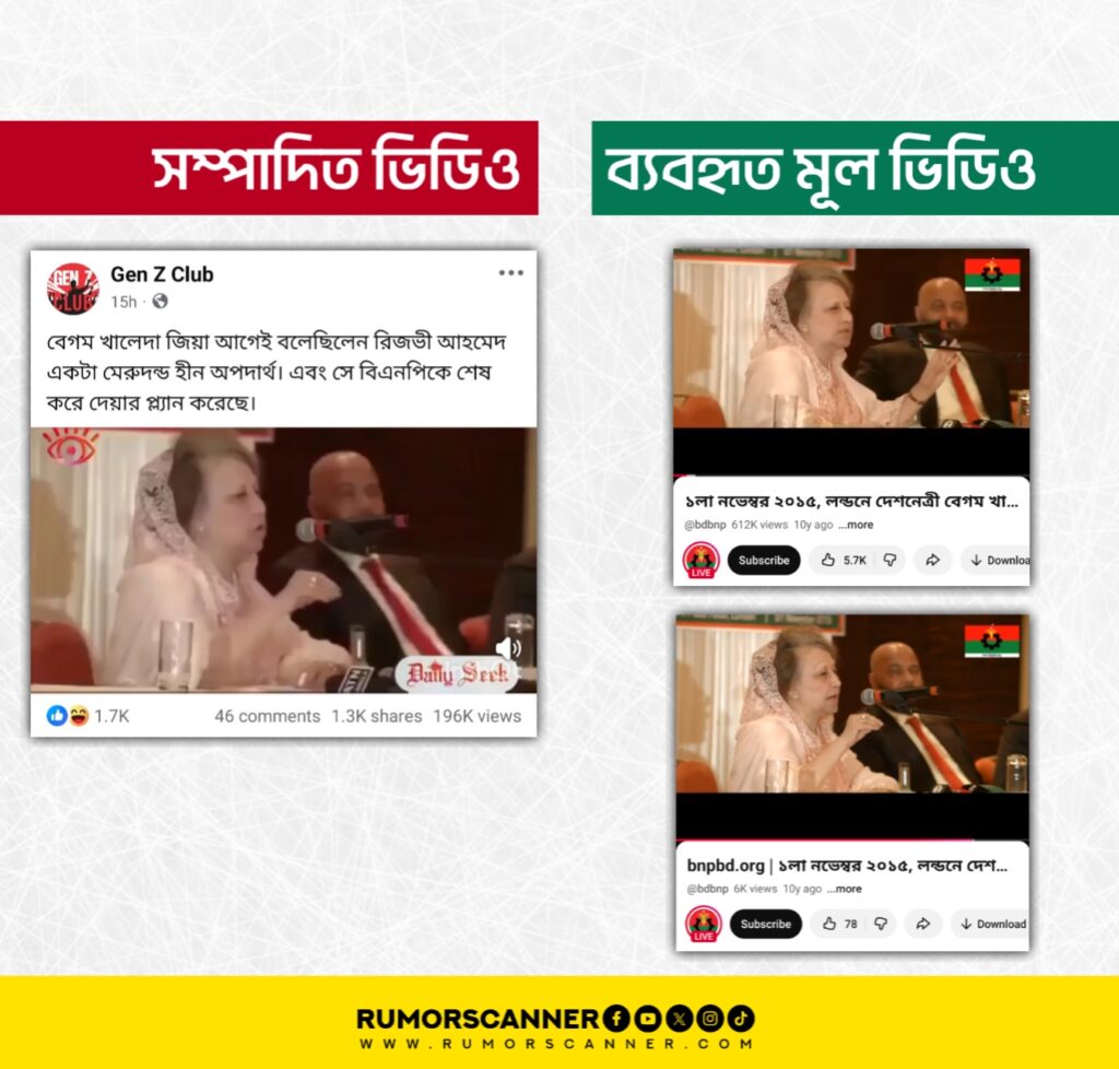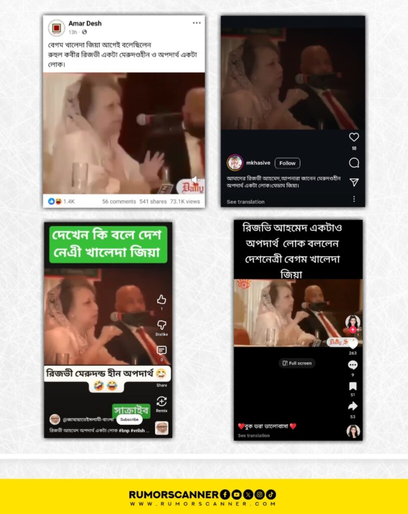 রিউমর স্ক্যানার টিমের অনুসন্ধানে জানা যায়, প্রচারিত ভিডিওতে রুহুল কবির রিজভীকে মেরুদণ্ডহীন অপদার্থ একটা লোক বলে খালেদা জিয়া কোনো মন্তব্য করেননি। প্রকৃতপক্ষে, ২০১৫ সালে খালেদা জিয়ার লন্ডনে দেওয়া একটি বক্তব্যের ভিন্ন ভিন্ন খন্ডিত অংশ আগে পিছে যুক্ত করে আলোচিত ভিডিওটি তৈরি করে প্রচার করা হয়েছে। খালেদা জিয়া তার উক্ত বক্তব্যে তৎকালীন নির্বাচন কমিশনার কাজী রকিবউদ্দীন আহমদেকে মেরুদণ্ডহীন অপদার্থ লোক বলেছিলেন।