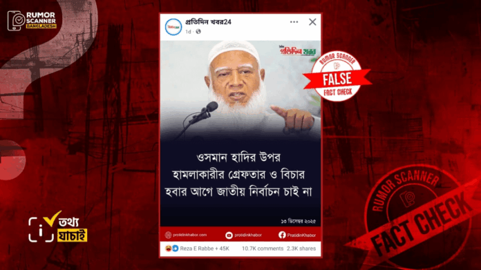 ‘ওসমান হাদির উপর হামলাকারীর গ্রেফতার ও বিচার হবার আগে জাতীয় নির্বাচন চাই না’ বলে মন্তব্য করেননি জামায়াত আমীর