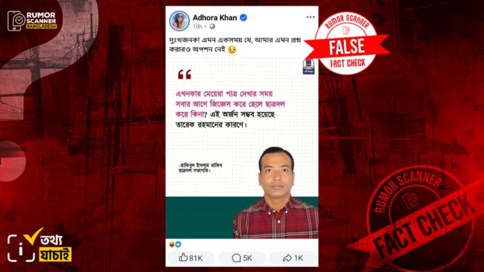 ঢাবি ছাত্রদল নেত্রী তাওহিদার নামে ভুয়া মন্তব্য প্রচার