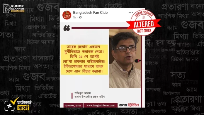 তারেক রহমানের বিরুদ্ধে শফিকুল আলমের মন্তব্য দাবিতে বাংলা ট্রিবিউনের নামে সম্পাদিত ফটোকার্ড প্রচার