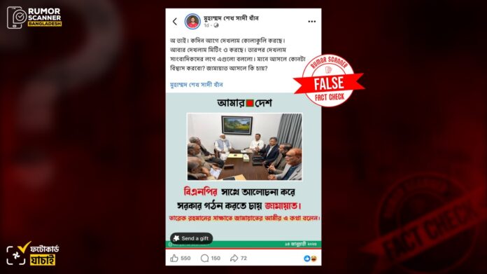 বিএনপির সাথে আলোচনা করে সরকার গঠন করতে চায় জামায়াত শীর্ষক দাবিতে আমার দেশের নামে ভুয়া ফটোকার্ড প্রচার